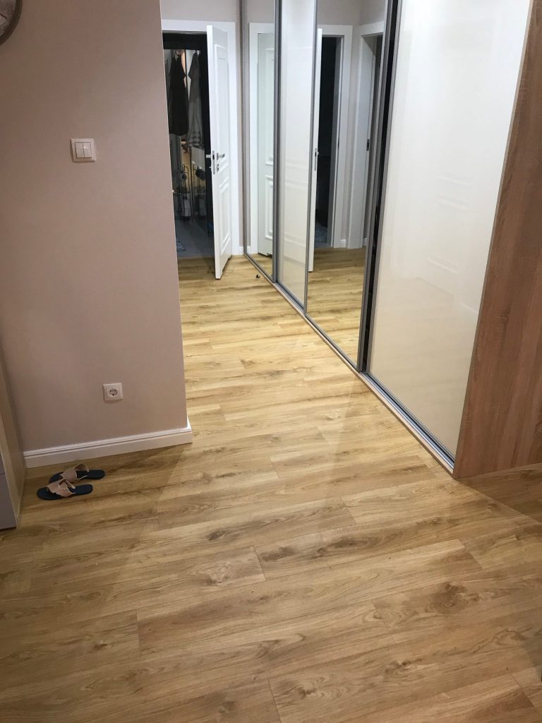 Prezentujemy Państwu jedną z naszych zrealizowanych prac wykończeniowych. Montaż podłóg winylowych firmy PERGO (dąb naturalny klasyczny), Listwy przypodłogowe LAGRUS oraz Drzwi POL-SKONE Inverno.